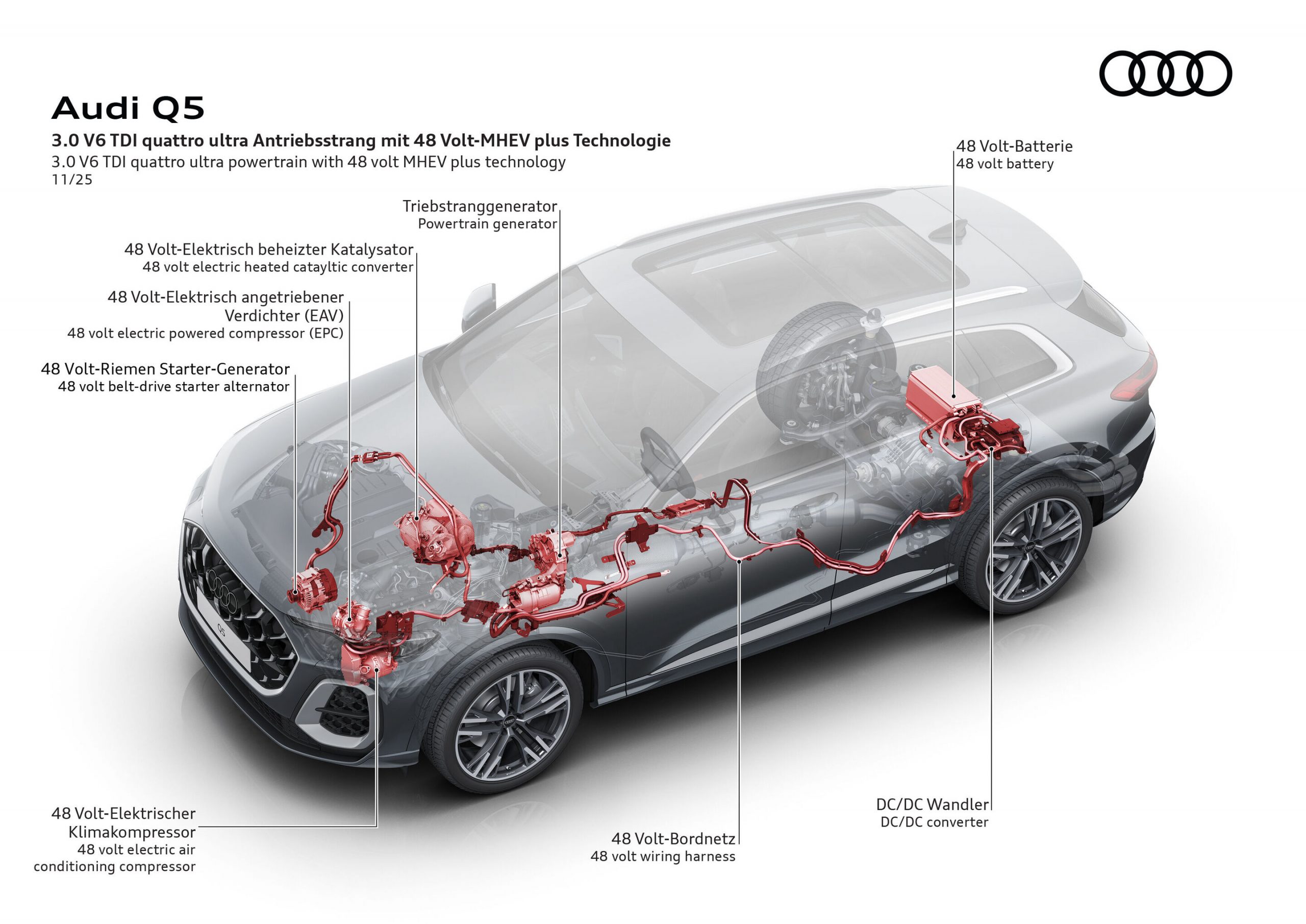 Audi is expanding its engine lineup for the Audi Q5 (combined fuel consumption in l/100 km: 6.8–5.8 (34.6–40.6 US mpg); combined CO2 emissions in g/km: 177–153 (284.9–246.2 g/mi); CO2 class: G–E) and Audi A6 (combined fuel consumption in l/100 km: 6.1–5.3 (38.6–44.4 US mpg); combined CO2 emissions in g/km: 165–140 (265.5–225.3 g/mi); CO2 class: F–E) with a three-liter V6 diesel engine delivering 220 kW (299 PS) and 580 Nm of torque. For the first time, the MHEV plus technology, which delivers up to 18 kW (24 PS) of additional power, is being used in combination with an electrically powered compressor. The engine therefore sets new standards compared to its predecessors. The interaction of three electrified components ensures immense driving fun and highly efficient performance. The V6 TDI quattro can now be ordered for both models.